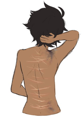 Sigamos con Luca, la marca que se ve en su espalda no es una sola cicatriz, sino muchas que le quedaron cuando, durante el Declive fue tomado prisionero y esclavisado, siendo usado como "mina humana" no se salvó de que los capataces y/o soldados le dieran de latigazos cuando se ensañaban con él, las heridas fueron tantas (y algunas tan grandes o profundas) que al sanarse quedaron como una gran marca en su espalda.