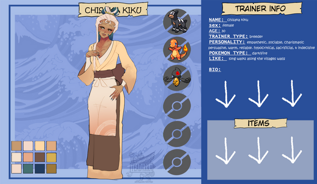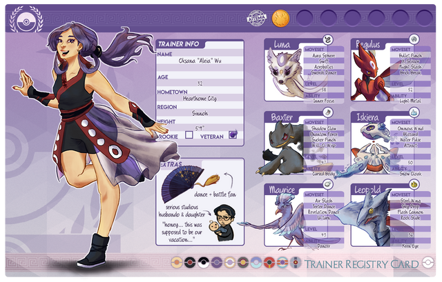 History: Unova born and raised, Ish loves to travel and spends most her time abroad competing in Pokemon contests. While her expertise lies in the more glamorous side of Pokemon training, the Aitema region has piqued her interest.