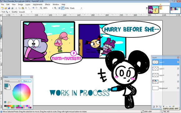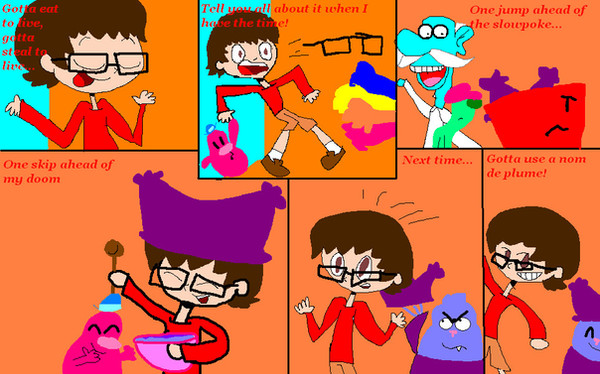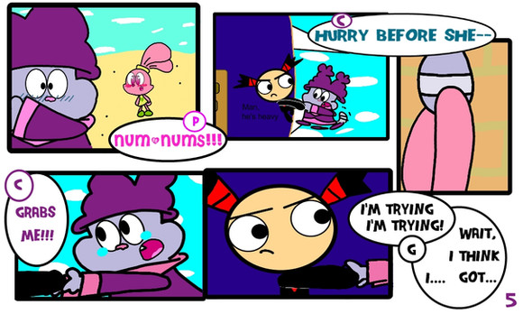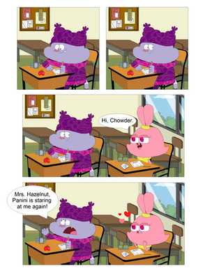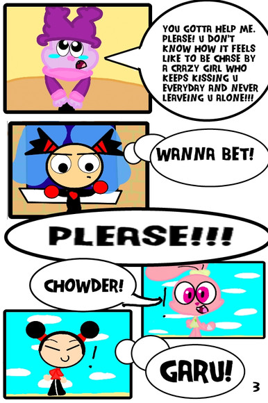 Since this is my first comic, I'll practice along the way. As usual, Panini chases Chowder around Marzipan City, but this time she's not giving up. They end up in strange places and meet new friends(cross-overs). I'll try to make a page per a day. Hope u like it.Page 2: Link