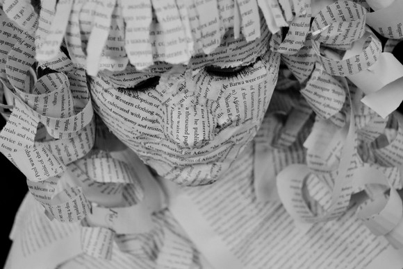 A lot of time and patience! I put a plastic bag over my head to protect my hair (Not a whole bag, otherwise i'd suffocate!) and then I covered everything in paper mache except for a small breathing hole for my nose, and a tiny slit for an eye. (both of which I photoshopped out). And as for taking the photograph, my camera was on a tripod and I used a remote control.