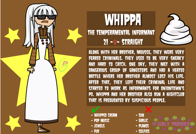 I always feared the day when I had to draw Yippy. She is one of my top characters, but I didn't know how to design her. She is a childish teenager, so I had to manage how to make her look younger than my other female designs because girls have breasts and bigger hips, but she is a kid, so I couldn't do breasts or huge hips. I also tried to keep in mind that she is getting into puberty so she would have a little bit of hips. For her face, it was a huge problem because I didn't know how to make her look younger, and the magic was on the lips, making a male kind of lip gave her a more childish face, so it worked for me. At the end, I liked her a lot, I struggled, but I learned.