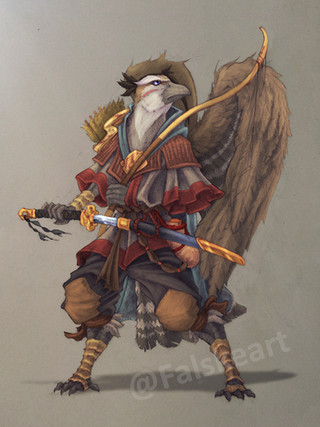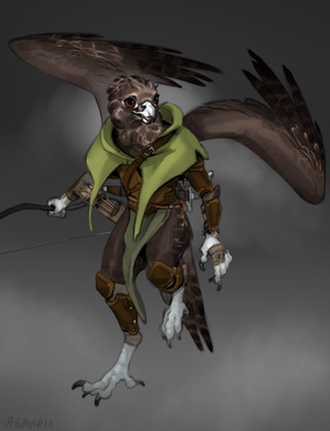 The bird species is based on the shrike, a little raptor that hunts mice and impales their victims on thorns and sharpened sticks. Perfect for a hunter and archer.