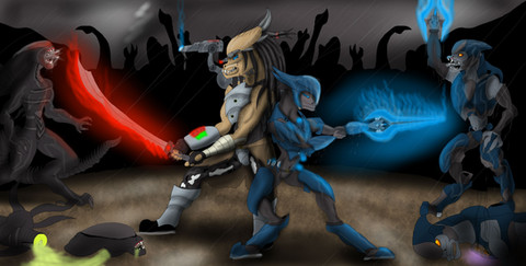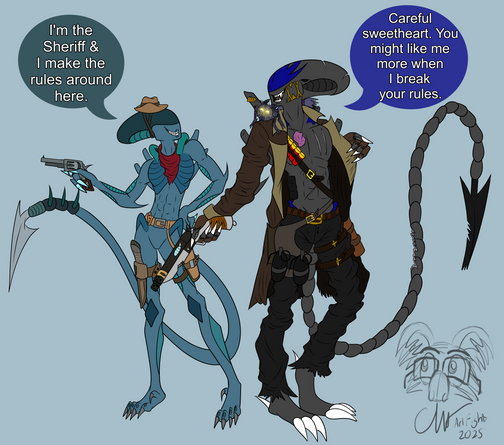 Been awhile since I did a drawing or finished a sketch. About time I got back into some more serious picturesAfter did a sketch of my newer character Rolo (which can be found here ), I decided to finish this older sketch which included Rolo, Flinch , & Ray , interacting