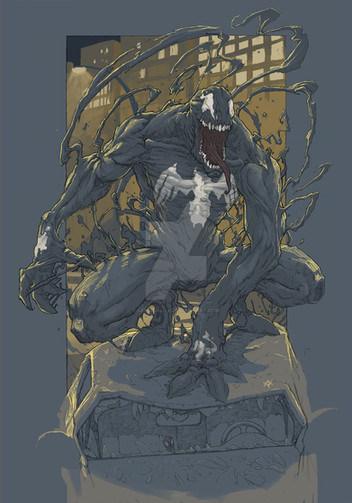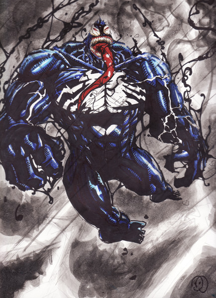 Believe it or not, this is the first Venom commission Ive done. Kinda strange, right? After all these years and probably a couple hundred commissions, this is the first Venom. Weird. Anyways, thats too bad because I had a really good time working on him. He's one of those characters that you can really put your own stamp on in terms of overall look.I wasnt really sure what I wanted my Venom to look like, but I remembered an image I'd seen once by Simon Bisley. It looked almost like a gorilla had been taken over by the symbiote and I really liked that idea. It was different and kinda funky looking. This is sort of my take on that with the huge arms, long torso and kind of short legs. The face is a bit of a generic Venom though.
