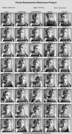 Idea for a new project. Someone mentioned it would be helpful to see basic emotions in front, 3/4 and profile view (I regrettably lost track of who thoughSince each expression requires three shots I tried to narrow down the emotions. In this case joy, sadness, fear, anger and disgust. I also made the distinction between polite smile (smile) and true smile (joy), because the differences can be very different.