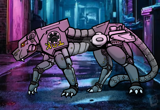 A combat cyberwolf is a battlefield predator that inspires immediate fear in most enemies. A modified purpose-built AI controls an armored carnivore form. Popular models include tigers and various large cat breeds, bears, dogs to wolves, and more. Usually a cyberpred is paired with an operator for mission specific objectives or for protection detail. They can be outfitted with weapons, recon gear, supplies (IE: packmule), and more.