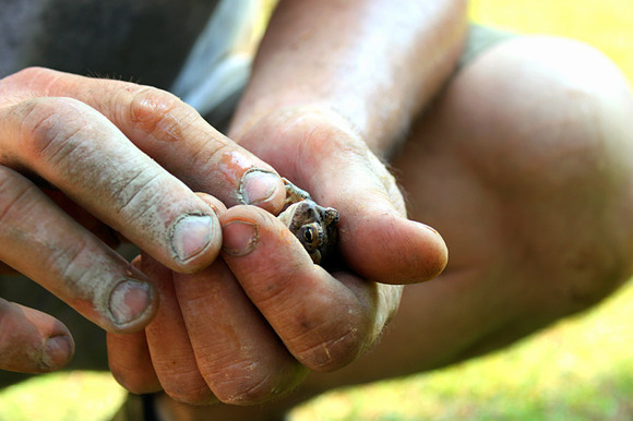 Clay from my grandparent's forest mixed with sand, some chopsticks, and a paring knife for sculpting.