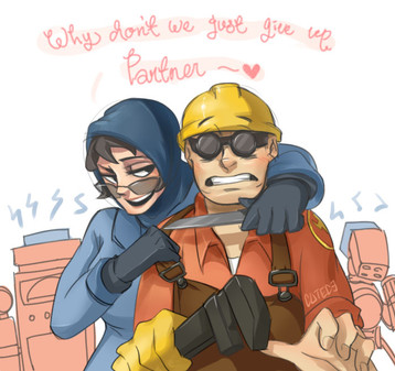 hehe ^^ well a friend of mine wrote a fanfiction (part german, text in english) where my charaacter appears. in the second part im doing. its gonna be a blue spy and my sniper s sister thing *Smirks*