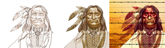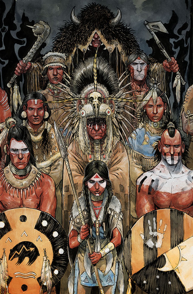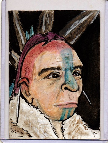 I grew up in the North American Southwest, so I've always had an affinity for Native American Imagery... I specially love those oooold black and white photos of Chieftains... there's an honesty to those photographs that is hard to describe, specially when you think in hindsight to what happened to the great majority of those tribes.... anyway, this started out as a doodle in a sketchbook looking at some of those old images... this is no one in particular, I was looking at different photographs and this is an amalgamation of those.... then I scanned it to do some simple coloring and it just kinda' went off on it's own!I've been drawing so many superheroes lately that it was nice to do a different subject matter... I hate it when the brain starts to feel stagnant.