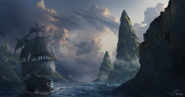 #rock #sea #ancientboat #cloudy #conceptart #dolphin #enviroment