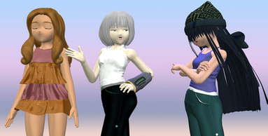 Took about 6 hours to complete, created the domain markings for each goddess in MS Paint then copied them into Photoshop for manipulation and adding skin colors, surfed for a texture for Belldandy's shirt, created a transparency map for Belldandy's shirt to remove the sleeves, converted ISOP's Victoria 2 Nurse dress to fit Mayadoll/Animedoll, converted ISOP's TentenJ Sailor Suit to fit Mayadoll/Animedoll, and played with eye color and eye shapes.