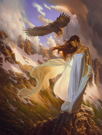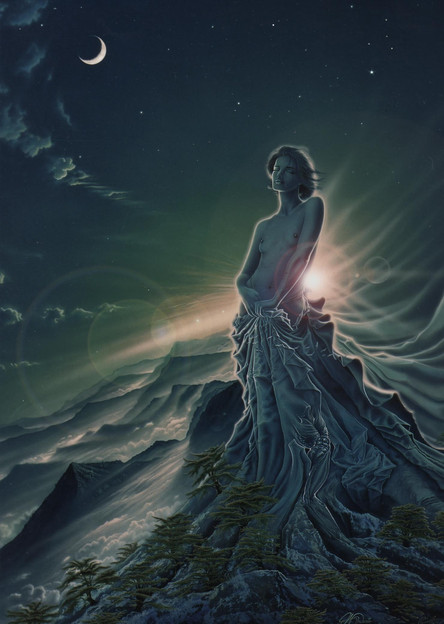 It is NOT oil. What!? Nooooooooo. Whaaaat!? This is epic!!! I love the linear lights in her dress and the point where she stands to flow with the birds into the mountains. Fantastic!