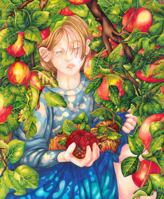 Extremely beautiful work and unique touch with the apples resembling eyes looking down at the scene almost as if they are curious onlookers. Also the the way the person in the shawl has their face turned away, hiding their identity further helps create a similar sense of mystery which is a little bit subversive given the bright sunny springtime setting of the scene. And I only just noticed the cat. Anyway this is fantastic