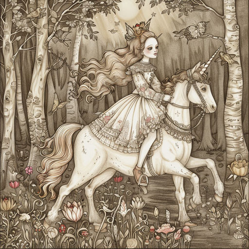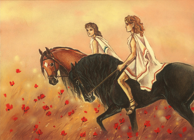 Just looking at this makes me feel good. My favourite parts are the poppies, the way the colors of the flowers, grass and sky work with each other, and the scribbly borders of the image. I also love the intricate design of the flowery pattern on the horse's gear.