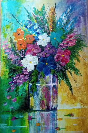 I painted this sitting in a park, looking at a flower pot. I didn’t want realism, but instead went for a style, playing with colors and technique.Related content