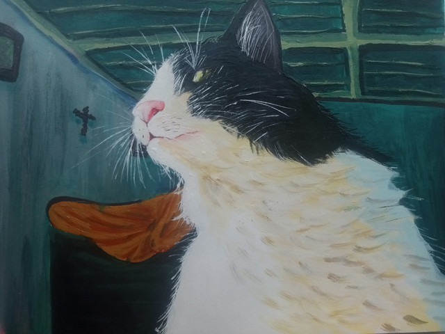 Our cat, painted for my daughters. I painted two acrylic pieces for them of their cat, Muse. He is a good boy.Related content