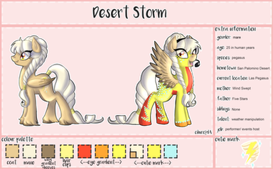yeah that's fine ^-^ it will be your OC after all. i'll message you when i get it done c: in return i'd like a drawing of my OC desert storm - fav.me/d9ffd7t