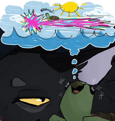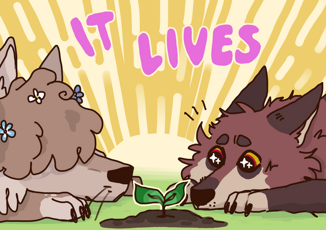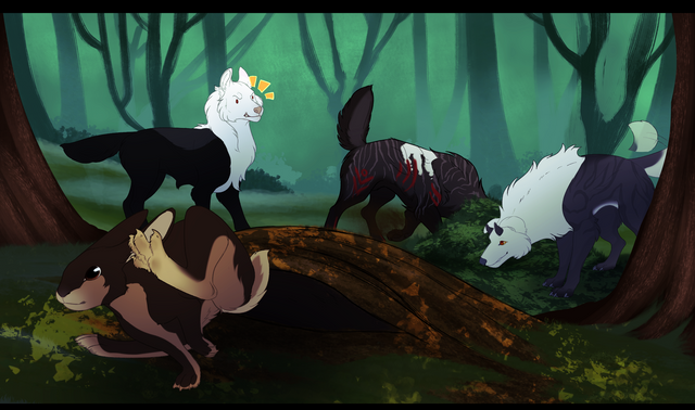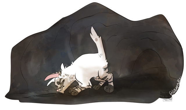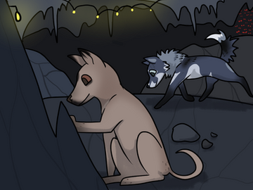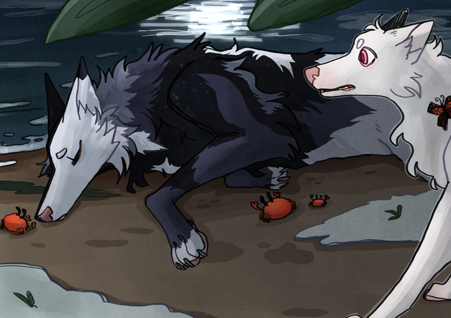 Crow is stuck babysitting Cali once again, but this time Wolf has a great idea: treasure hunt!It’s been years since Crow dug some good old holes in the dirt and when he turns and sees just how dirty Cali’s pale fur is he just can’t help a big laugh escaping his mouth. And oh! Wolf actually found a cool looking resin!