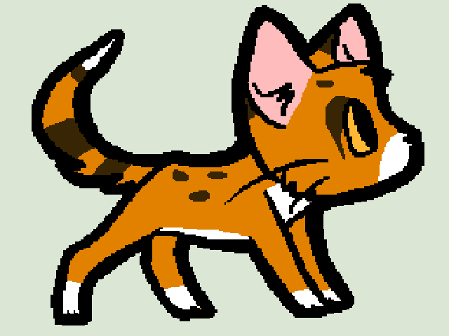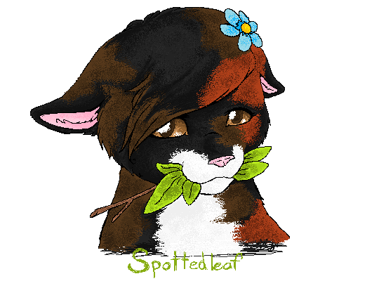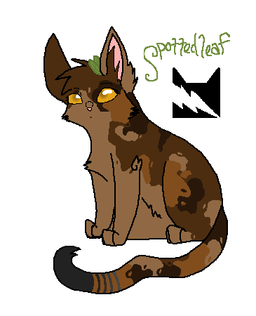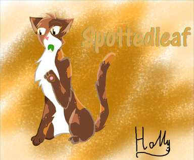 Spottedleaf is a beautiful young dark tortoiseshell she-cat with amber eyes, a white muzzle, white paws, a white chest, a black-tipped tail, and a distinctive dappled coat. Her eyes have circles of dark fur around them, and one is darker than the other. She also has a light brown tabby striped tail.