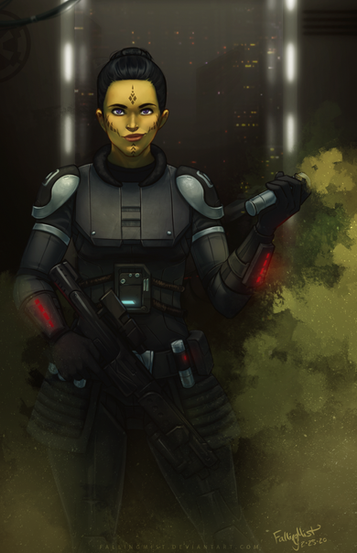 Abesh is the daughter of Ciryc Woor Hutsii, her mother died when she was young. That's why she worked with her father as a bounty hunter from an young age. Now she is taking care of Carud Vales youngest daughter Mirj.
