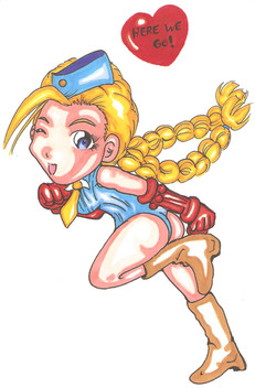 This is a picture of pinky chun li and cammy stuck in a monster's stomach !! I know the idea sounds crazy but I think that this picture came out pretty well . it took about eight hours to complete and it was made with india ink , caligraphy pens , prismacolor markers , pencils and last but not least deleter white ink . (cammy is stuck in a doughnut *^.^) enjoy!!(this is for the cammyfan contest !!!*) Go to cammyfan.com to enjoy the awesomeness that is Cammy white!!!Related content