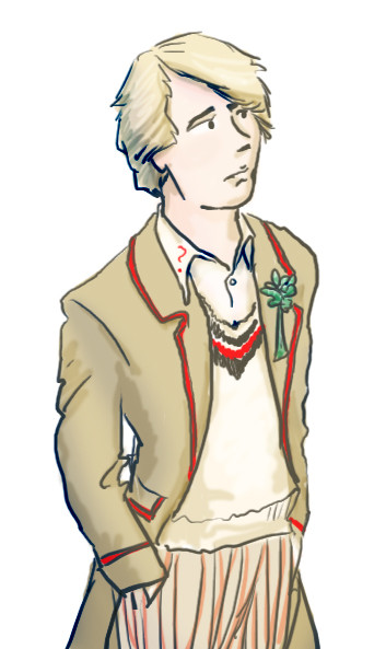 Oh, I rather like this. I love his mussed hair and the sort of over-all rumpled look. And, dear Lord, but he is so young. Yes. I like this quite a bit. And you've included the eternal lapel celery. A must. There are too few depictions of the Fifth Doctor and he's really rather adorable. David Tennant took a lot of cues from Peter Davison's Doctor and I often find there is a strong element of continuity between Five and Ten. I'd love to see you do more.