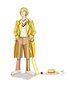 What a lovely depiction of Five, with the mussed up hair, serene expression (now that's cricket!) and the Gallifreyan in the background.Β