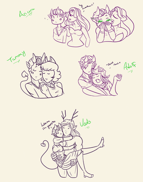 These guys make my heart blush omg. I feel as though these two are really just openly affectionate with each other? Maybe because they grew up with one another so it's just natural. They are also a very rough couple 6v6 so cute romantic wrestling is sure to ensue. I figured i'd draw them in their old band tees 9v9 with maybe their old CD's playing in the background. Hmmm and I imagine they sing to eachother a lot! Just an out of nowhere melody of the heart, they can't help it!