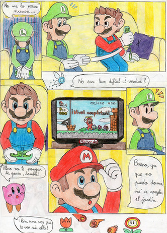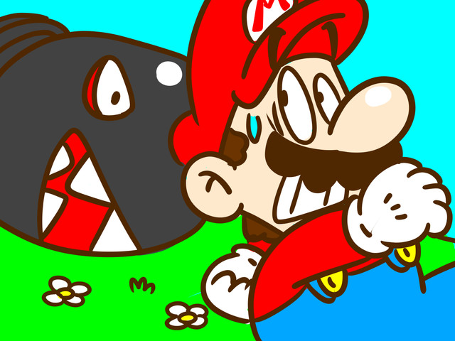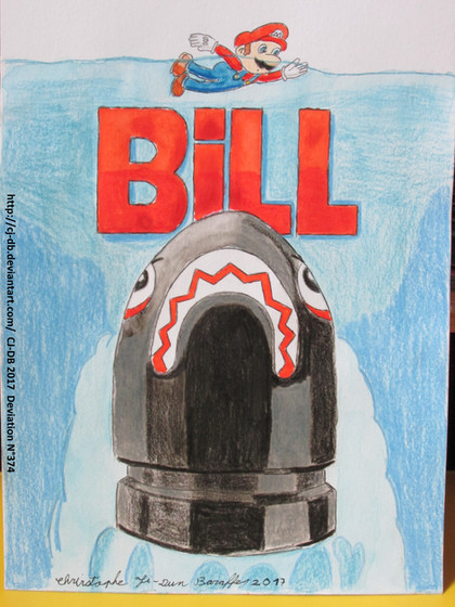 English: Mario! Warning! There's a Bill behind you! What? He wants to be your friend. What luck!This drawing is done in watercolors and colored pencils in 2017.