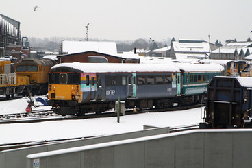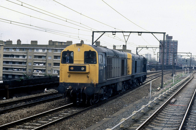 Here we see a brace of three Class 20's moving away from the station heading back towards the depot. These machines date back to the very beginning of the BR Modernisation Plan, and were the first mass produced mainline diesel locomotives. Built to a standard of design set by the steam era, the locos have only one cab, and thus with a change in diesel locomotive designs with full cab fronts taking over from bonnet end fronts, they often work in pairs cab forwards at either end.