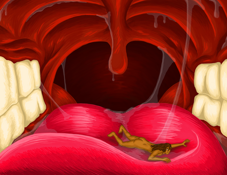 In the story of Issun-boshi, he was swallowed alive by an oni (Japanese ogre) and cut his way out through the oni's throat