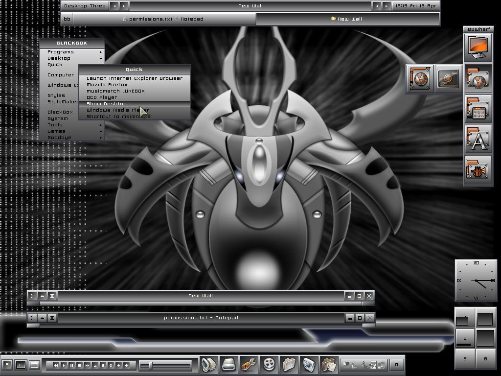 Blackbox 0.61.1 on debian woody. Wallpaper from deaddreamers, and a modified gkrellm skin.Related content
