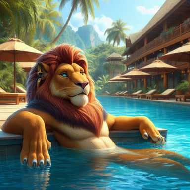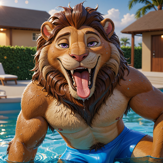 #anthro #fantasy_character #furry #illustration #lion #pool #sunset #swimming #digital_art #palm_trees #snow_leopard #water_droplets #neon_colors #big_cat #furry_art #sharp_teeth #tongue_out #male_anthro #evening_light #colorful_furry #purple_mane #fluffy_fur #summer_vibes #turquoise_fur #hybrid_feline #spotted_fur #smiling_character #playful_pose #resort_pool #snowleopard_spots