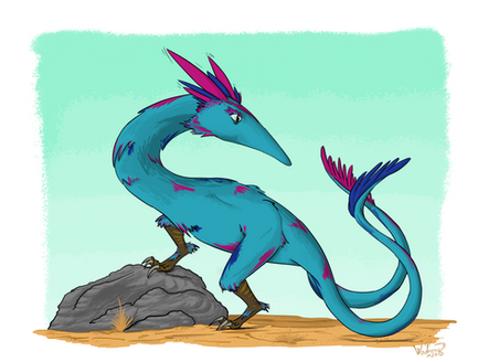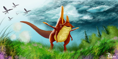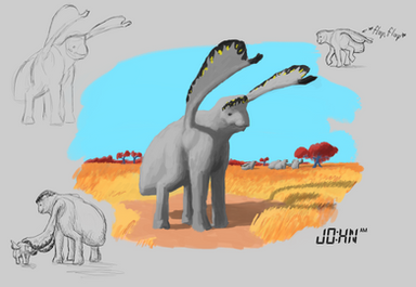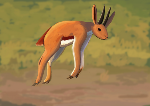 One of the more iconic snouters, the earwing (Otopteryx volitans) is a highly derived hopsorrhinid, which is able to fly using muscles and bones in its ears. Its nasarium, like all hopsorrhinids, is jointed and serves as an effective means of locomotion on the ground. Back when the Hy-yi-yi archipelago still existed, Earwings were a common sight in the mountain meadows of the larger islands.In the book, Otopteryx's pelt is described as being highly metallic looking, being comparable to hummingbirds and butterflies. Hopefully I didn't make it too dull. Also, a digital painting with a background! Not bad for a first try, right?