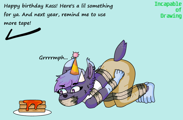 This was a piece for a friend of mine, featuring her Sona wrapped up nice and tight with duct tape! At least the captor was nice enough to give her breathing holesArt is by me