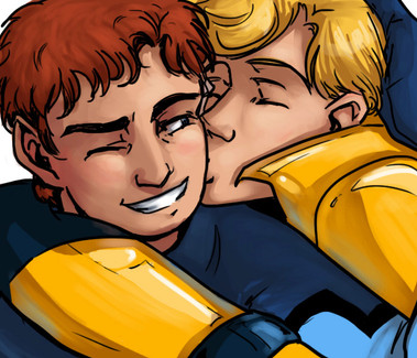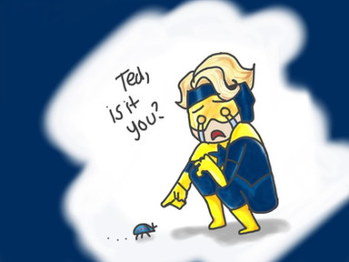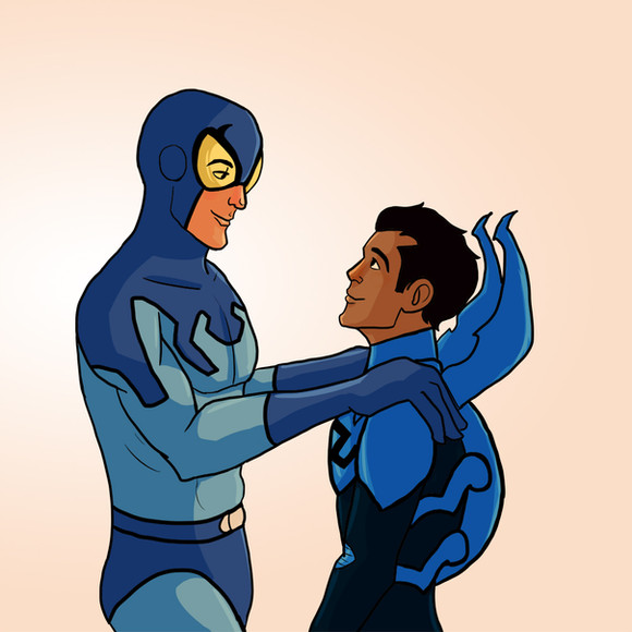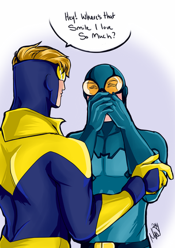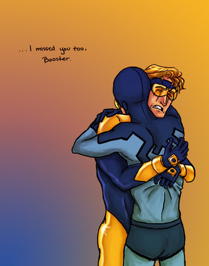Booster Gold & Blue Beetle.I would have put more effort into this, attempted to make it better, but I'm too tired and I just needed to get this down. Booster's bloody hair though, I can't get it right, so I went with this crap. I demasked them too, so they emotions on their face could be seen better. Fucked up colour, oops.