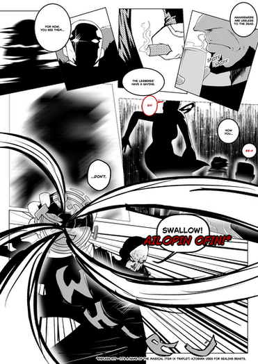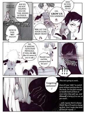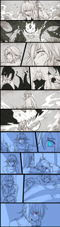 This is a collaboration with a few friends. Basically I start the comic with a simple opening: "Ileen enters the kitchen for a cup of tea to see someone digging through the fridge. 'Who's there?' she mumbles as she approaches the cold appliance with caution."People continued it with their own sentences, and I compiled them into this comic~!