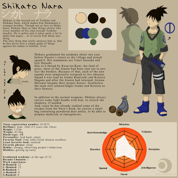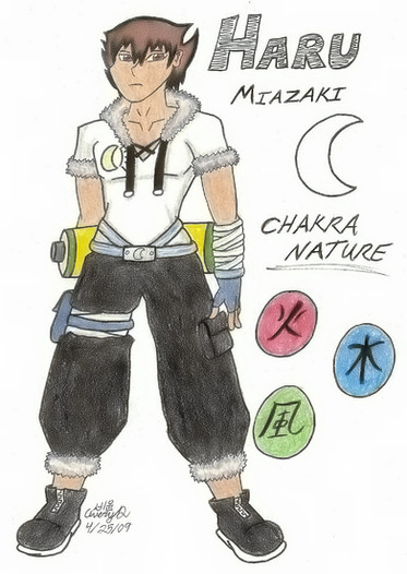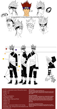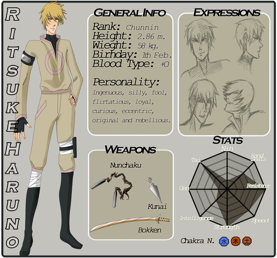 I love the profile you wrote for him. You have a lot of interesting details in there: my favourite bits were probably his sensei's tendency to go off for chats (all the dislikes you gave were great actually), the earring tradition and hair colour change of his clan, and the descriptions of his teammates. It all seems very human and real.