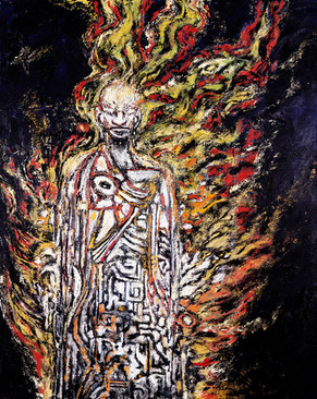 All these paintings are oil on canvas.I like to paint on canvases that offer me enough room to really get a nice thickness of differing colours,leaving the work to dry for three or four months. That way I can put a contrasting colour on top of what is now dry and stable. if i then want extra delineation in the image I take out my trusty steak knife ( I'm vegetarian,so this is the only use I have for them )and scratch through the wet coat to reveal the colour beneath.My favorite canvas size is four feet by five feet.I hope that's useful.