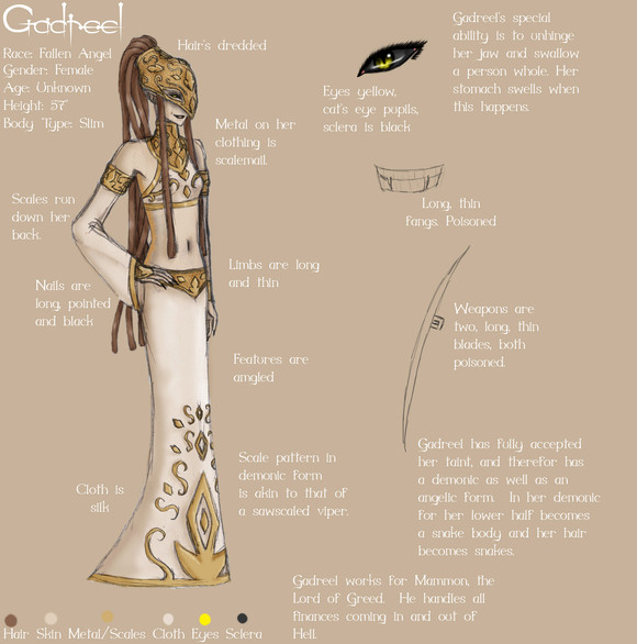• Personality: She is very interested in any and all forms of talk, flirting, quick chats, political debate, intellectual debate and even gossip. She has a very active mind able to juggle multiple tasks in her mind at once, but if she focuses on one thing for too long she will become very bored of it and dismiss it, not matter the important, thus she is never known for being loyal to any side of the balance.