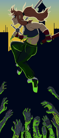 I like the texture you used for the trees, very realistic. The perspective on Johnson looks a bit off, but I like the way you did his clothing as well. Linu's hand looks a but deformed as well, very short fingers.