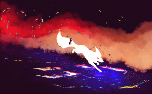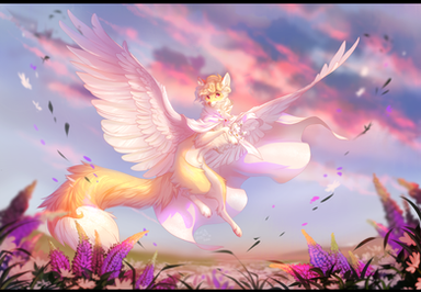 I just.... Okay I just want to say, that the overall lighting from your bby, to the water, and to the background is absolutely stunning! The clouds as well in the background is just too beautiful (cause like I ALWAYS fall in love with your clouds) and the droplets/shine effect in the foreground really makes the picture lifelike to the details you put in with your work! I really love how you can see the lighting through the birds wings, and I also love the amount of detail on saiaun's fur too! The shading detail on the rose/bell and even the eyes makes this picture a bit more dynamic that follows a sweet and soft atmosphere to it-