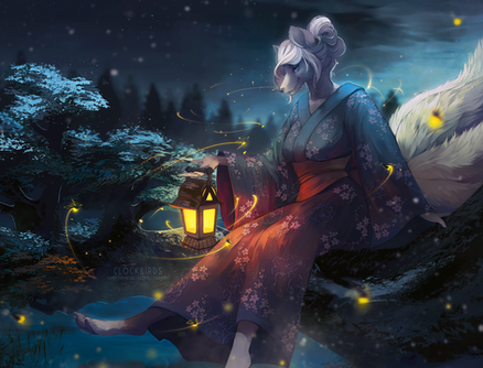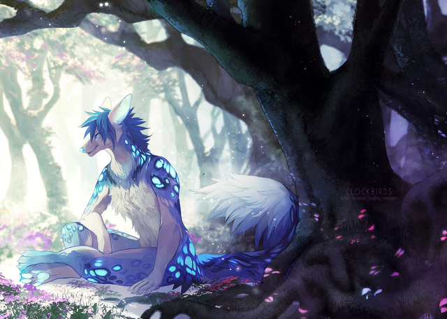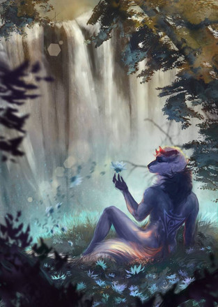 Let me start with the lighting, I love the lighting and the glow that comes from the character and it gives the very serene and calm atmosphere. The way that it comes from the trees and then to the foreground makes it so lifelike and very warm. Also, I have to add that your leaf game is so on point! Oh my gosh I just love the leaves in this picture and the way they are bunched up and painted perfectly as well as how they are just caught in the wind and how the reach the foreground as well~! The way they get from bright to dark based on the contrasting light, and how well they also look with the bark of the trees is just absolutely stunning and beautiful!! Now I have to add the water, I have to talk about the water, I LOVE how you drew out the water it looks so clean and crisp and seeing the light from the water and how it falls down from the rocks like a small waterfall is just absolutely STUNNING. And also I got to add that I love the details on the fur and the anatomy because it feels so real and also...