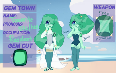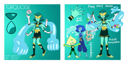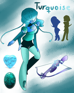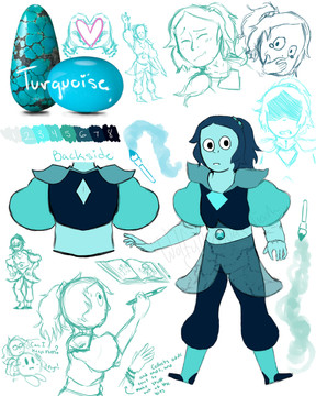 Story: She was a Turquoise with high reputation compared to the others. She often acted as a leader when multiple were sent out, or working with those of a smaller reputation in her missions. She used to co-work mainly with a Lapis Lazuli for a long time, until that Lapis got reassigned to Yellow Diamond. Leaving her to go on missions to different planets than Turquoise. When the war started, Turquoise took much part in it. However, she had nearly gotten poofed or shattered on many different occasions. Near the end of the war, she was poofed. However it was by another gem on accident without them realizing that they poofed her. She was left on a ship, used by that same gem to escape the war along with two others. However, it landed on a different planet than wanted to due to the ship crashing. The gem got out and headed much farther off, while Turquoise reformed only a week later. Leaving her to some stray planet for a while with a few other gems. While her time there, she eventually goes through a lot of questioning on what she feels, and also works with the other gems. Slowly but surely rebuilding it.