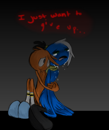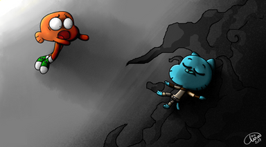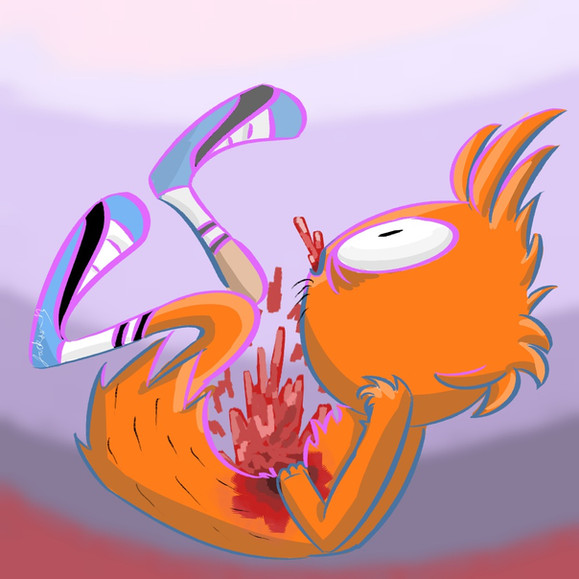Follow up to this:Β Later Ha--The basic idea to this is that--continuing from the last painting, where Wander was shot out of the saddle by Hater, much to everyone's surprise (including himself)--he falls down the canyon Sylvia and him were previously crossing. For the sake of basic cartoon law, he didn't die a realistic death (I mean, the dude is the size of a toddler and was just shot--before plummeting to the bottom of a canyon, so technically he should be dead) but unlike the usual stuff in WOY, he's actually hurt. Really, really, really badly, if it isn't obvious from how much fun I had painting all that blood. x'D Aaagain.