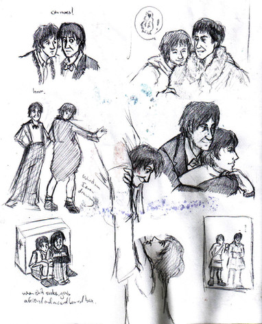 Oh, these are wonderful! I'm loving both your looser sketches and the heavier pen-work on that perfectly charming Merlin in the corner! ^__^ Great job with the expressions and subdued tones. (Ah, forgive me if I'm wrong, but is that Mulder and Scully near the top?)