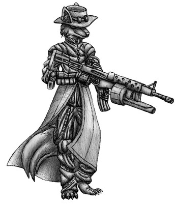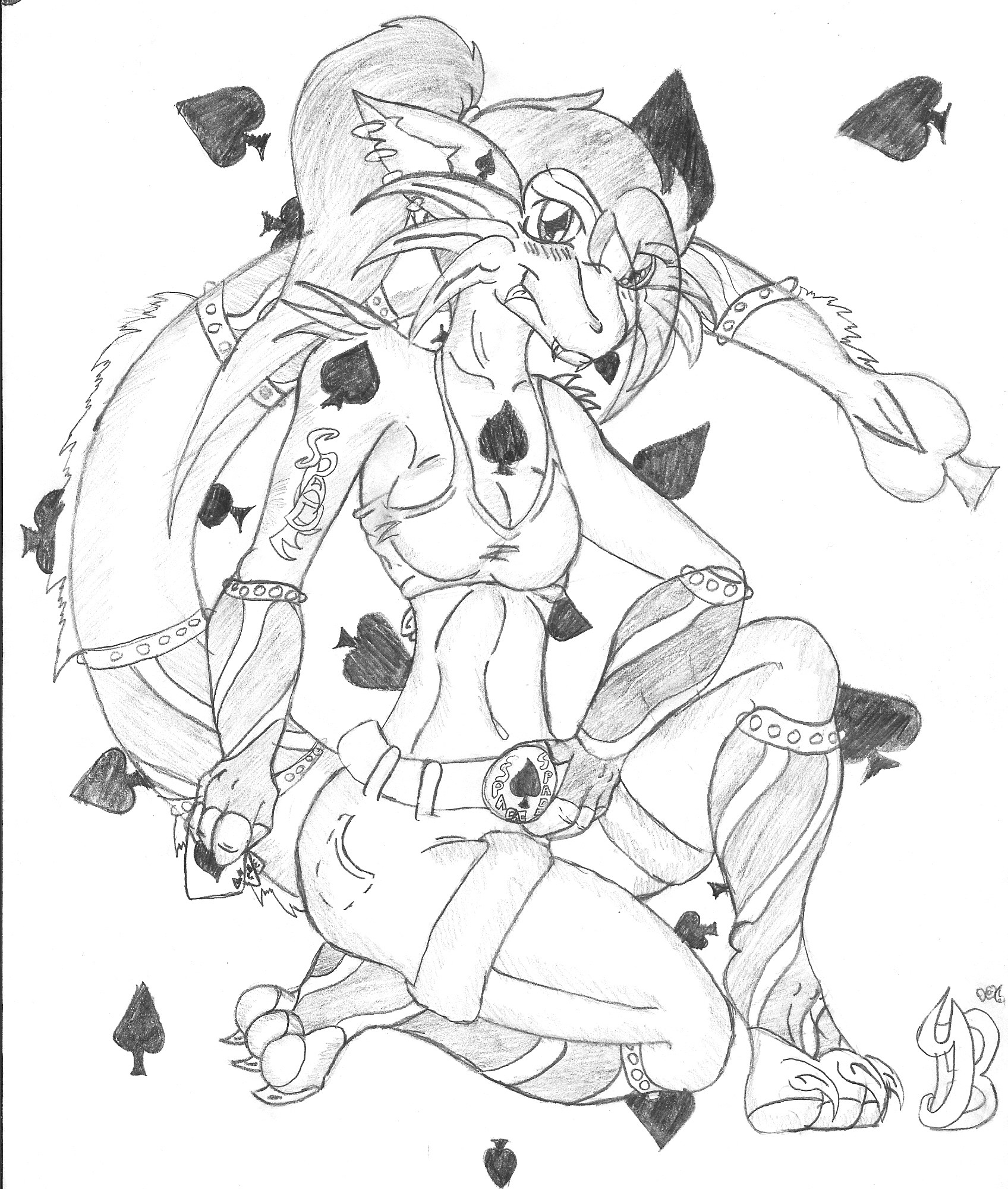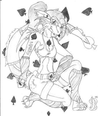 I hate my scanner!!!! >.<Ok pleas tell me that you guys can tell itβs a male. I was confronted by 2 friends that both thought it was a chick so I had to go back and make some changes. Anyways new character that popped into my head a few nights ago so I thought I would draw him. His name is Spade (for now) because of his obsession with spades. He believes that they are lucky because a long time ago he won a lot of money playing black jack and the hand that won him the game had 2 cars with spades on them. His hand was the ace of spades and 10 of spades. Thats about it I guess tell me what you think.
