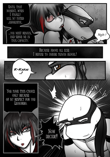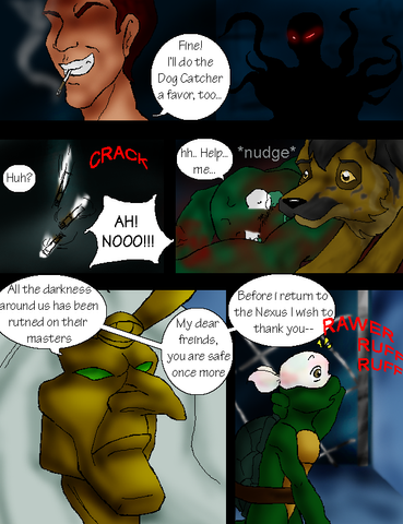 Uh oh. Raph is pissed.lol. Sorry it took so long to get this up again. So much is going on in real life, it's hard for me to keep up. Hopefully I'll have the next page out sooner. Hopefully. And just so readers know, I'll tell you that any of the parts so far with Finley in this chapter have been a flash back. The parts with the fox girl are the present. Thanks to everyone who's been reading and faving and also commenting so far! I hope you all continue to do so and thanks to any new readers who have just started also. Without all ya'll, I wouldn't be doing this comic.