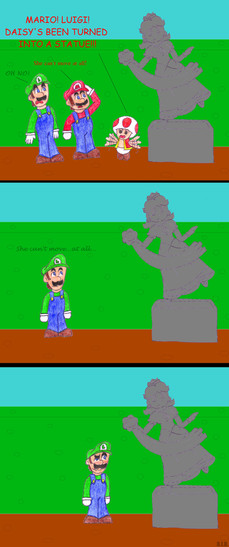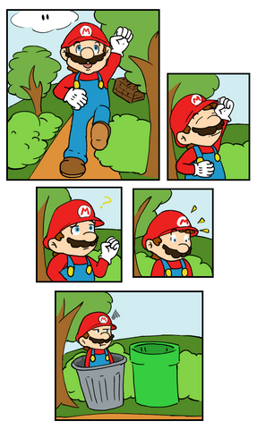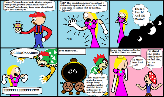 This was my first time trying to do a comic/comic strip/whatever I should be calling it, and I gotta say, drawing small scale is hard and annoying. Like, what you see here, that was all a single A4 sheet of paper. This is impressive for my standards. Although WFT in panel 5 looks a bit off. I just couldn't get her hair completely right. Also, some of the panels could probably have been replaced with something a little more meaningful than just Mario walking, but oh well, it's my first time, cut me some slack.