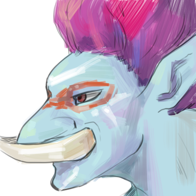 wow nasty burn he has there, did he get that in some kind of accident or? he has very fluffy hair i like when trolls males has a lot of hair and a nice set of tusks like he has. He looks like he is in a rather pissy mood, probably as you might have been due to the headache. though that aside i think his portrait turned out rather nice. hope to see more of him as i plow further into the gallery